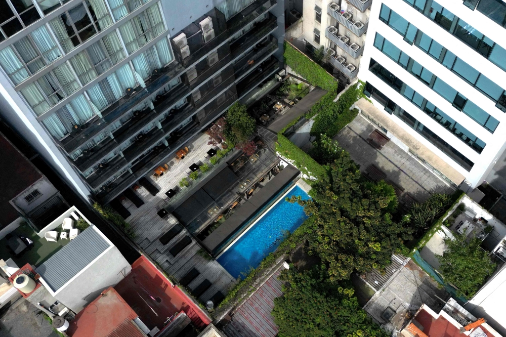 An aerial view of the poolside area of the hotel where British singer Liam Payne died in Buenos Aires, taken on October 17, 2024. Photo by Luis ROBAYO / AFP