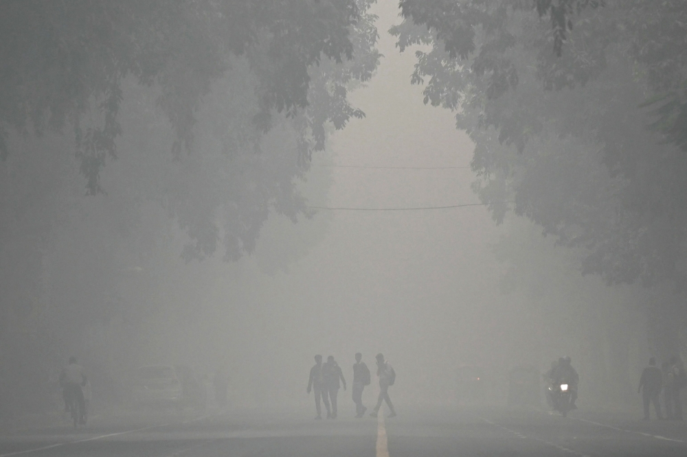 Pedestrians walk across a street on a cold smoggy morning in New Delhi on November 18, 2024. (Photo by Money Sharma / AFP)