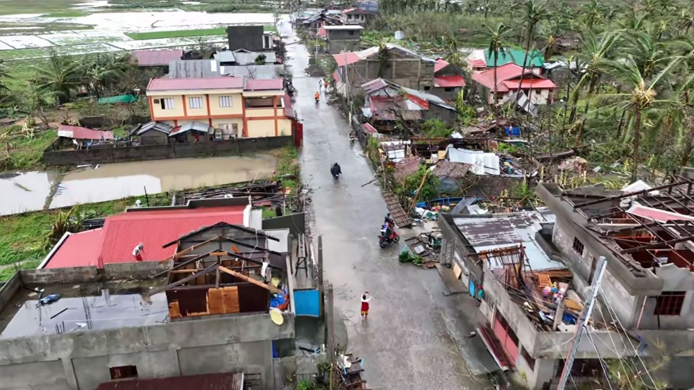 This frame grab from handout video footage taken and released on November 17, 2024 courtesy of Mayor Cesar Robles shows an aerial view of damaged houses in Panganiban town, Catanduanes province, after Super Typhoon Man-yi hit the province. (Photo by Handout / Mayor Cesar Robles / AFP) /