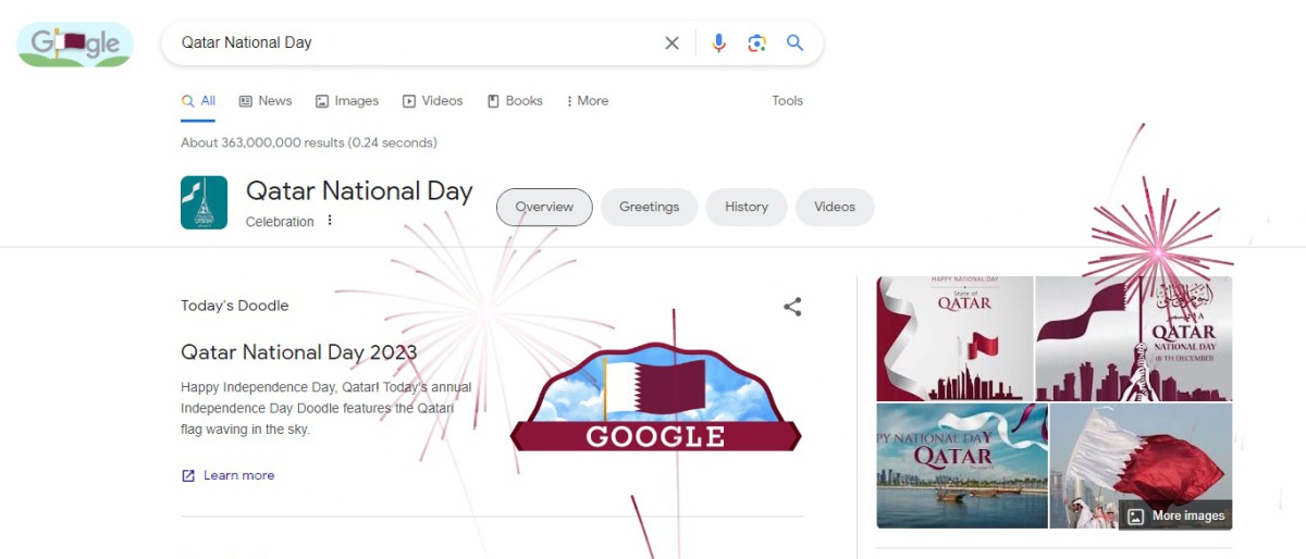 Users are greeted with Qatar's flag, fluttering against a blue sky, on Google's homepage as the country celebrates its national day today, December 18, 2023. Fireworks in maroon color can also be seen when one searches for the phrase "Qatar National Day" on the search engine.