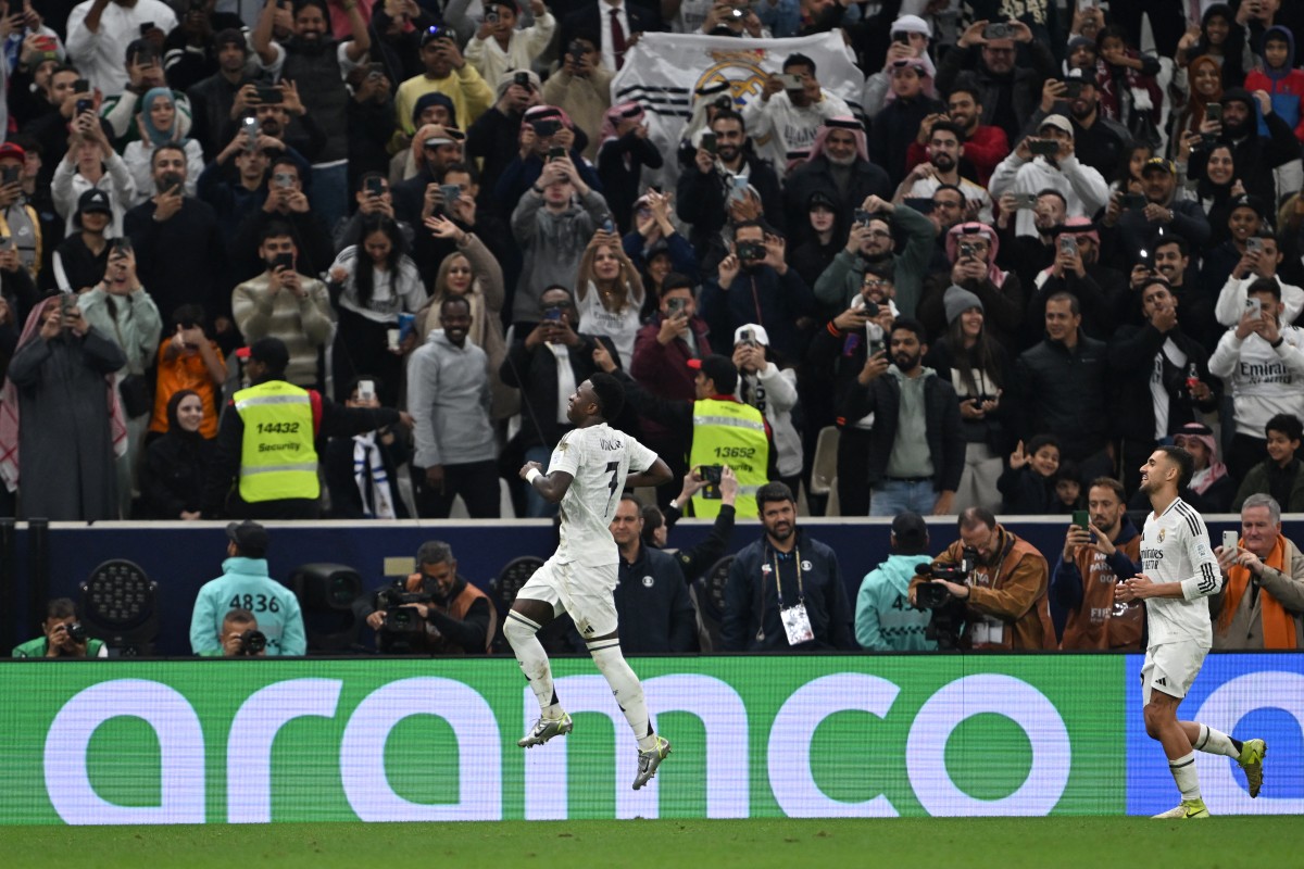 Real Madrid's Brazilian forward #7 Vinicius Junior celebrates after scoring his team's third goal from a penalty kick during the 2024 FIFA Intercontinental Cup final football match between Spain's Real Madrid and Mexico's Pachuca at the Lusail Stadium in Doha on December 18, 2024. (Photo by Mahmud HAMS / AFP)
