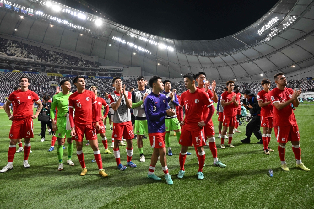 Hong Kong's players salute the attendance after the Qatar 2023 AFC Asian Cup Group C football match between Hong Kong and Iran at the Khalifa International Stadium in Doha on January 19, 2024. (Photo by Hector Retamal / AFP)