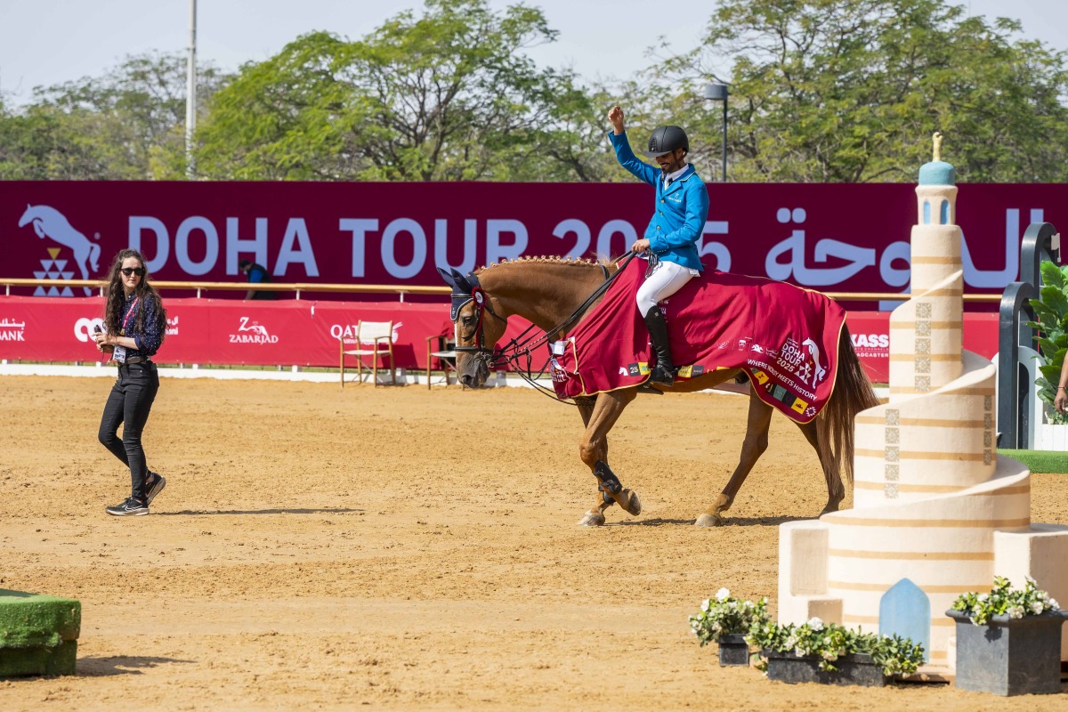 Portugal's Duarte Seabra astride Dourados 2 celebrates after winning the CSI4* Grand Prix title. The podium winners of the event were honoured by Doha International Tour Organizing Committee Chairman Rashid Nasser Al Kaabi, Secretary-General of Qatar Equestrian Federation and Organizing Committee Member Sheikh Ahmed bin Noah Al Thani.