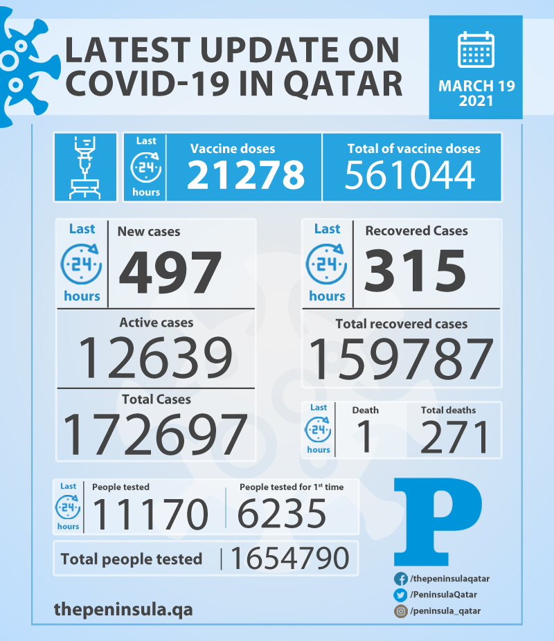 Doha: Ministry of Public Health (MoPH) today reported 497 new cases of coronavirus (Covid-19) and 315 people recovered from the virus in the last 24 hours, bringing the total number of people recovered in Qatar to 159,787.