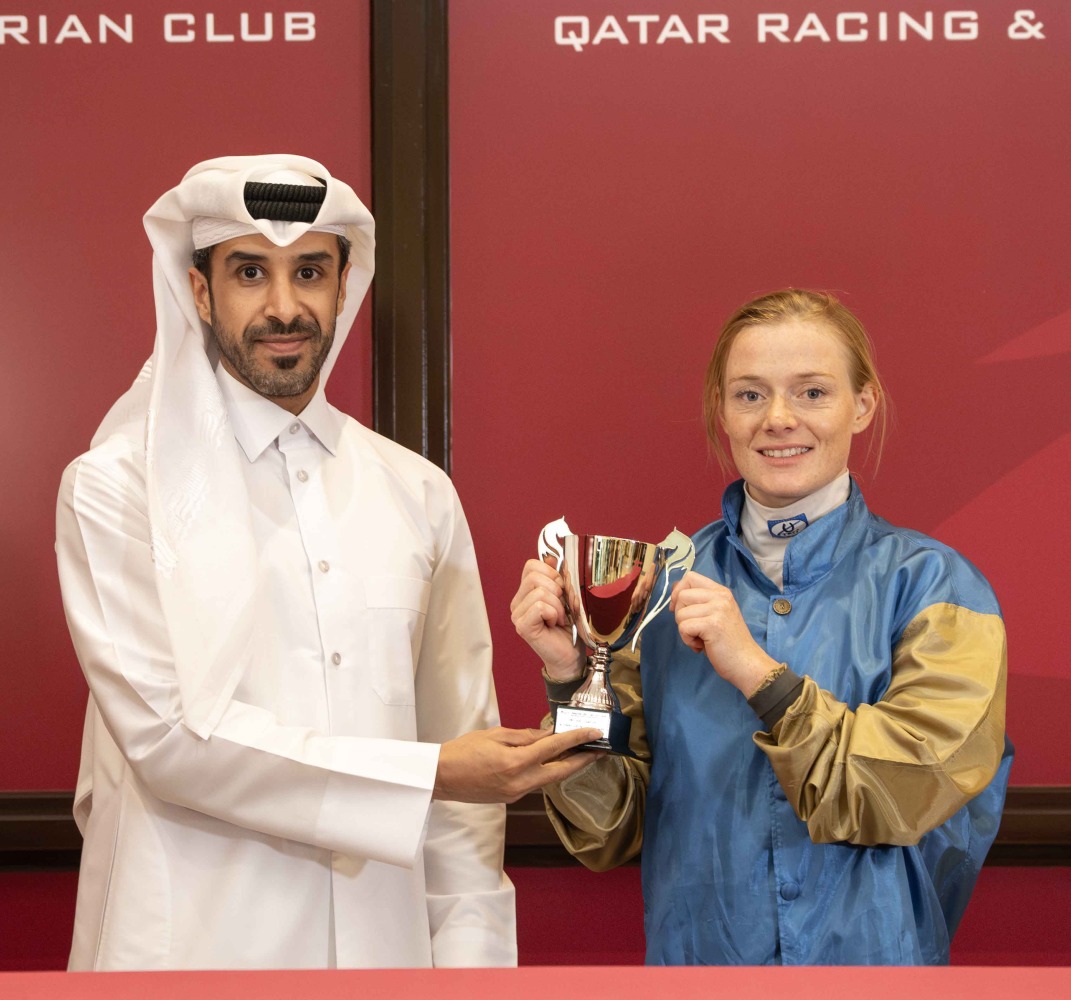 Deputy Director of the QREC Registration & Studbook Department Saad Ali Al Kubaisi presents the trophy to jockey Megane Peslier.
