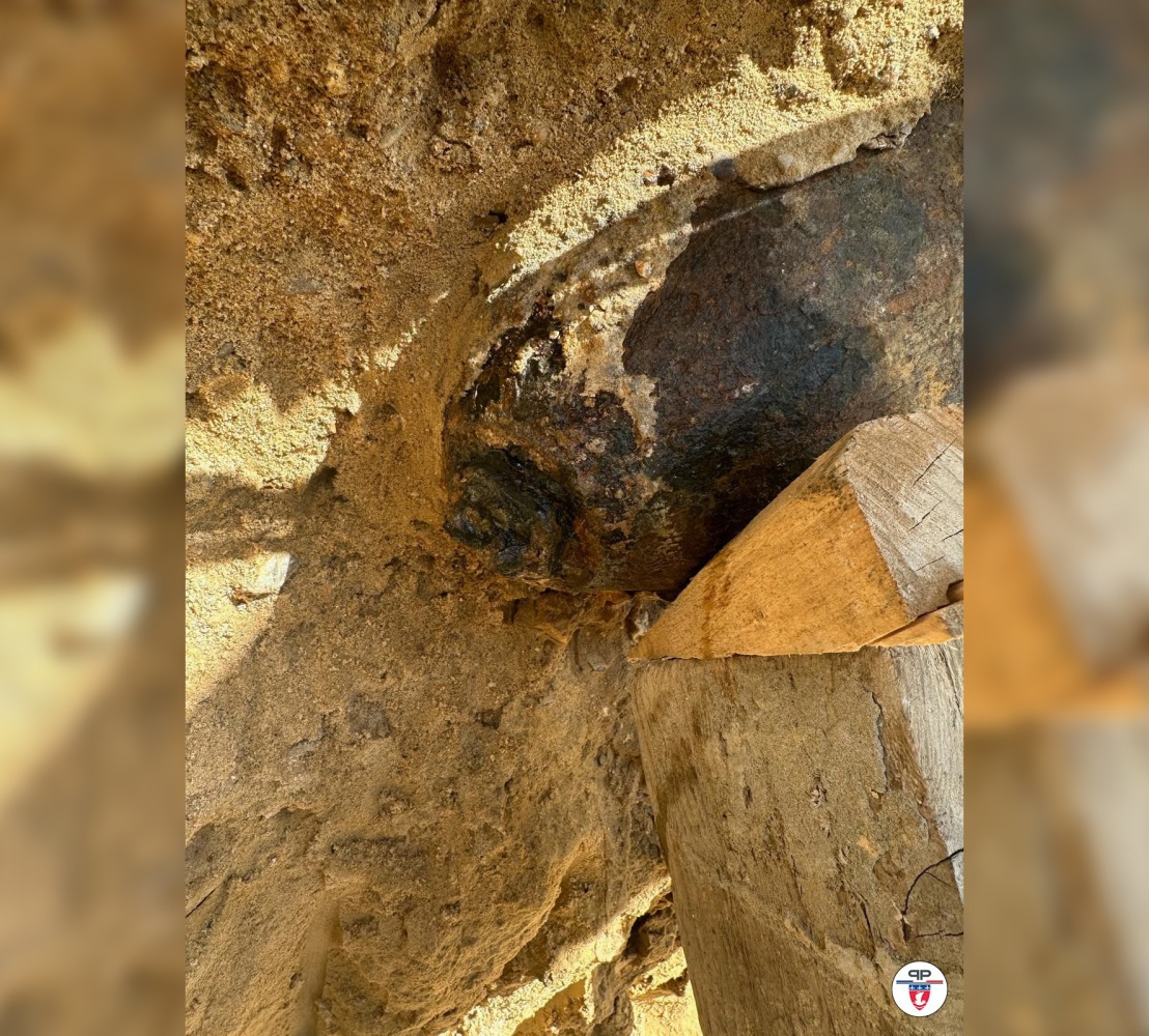 This undated handout photograph made available by the Precture de Police on April 19, 2026 shows a bomb from World War II partially uncovered near a residential area, prompting a vast operation by emergency services to neutralise the device, in Paris' northwestern suburb of Colombes. Photo by Handout / Préfecture de police / AFP