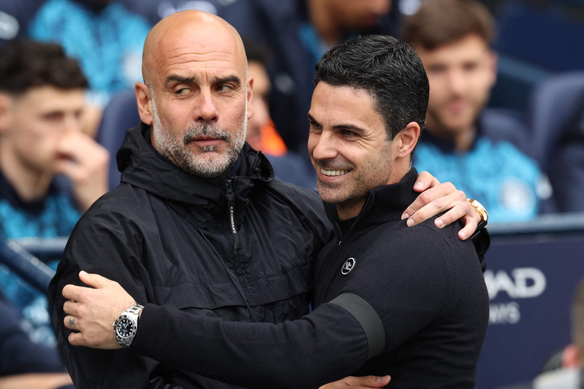 Manchester City's Spanish manager Pep Guardiola (L) embraces Arsenal's Spanish manager Mikel Arteta (R) before the start of the English Premier League football match between Manchester City and Arsenal at the Etihad Stadium in Manchester, north west England, on April 19, 2026. (Photo by Darren Staples / AFP)