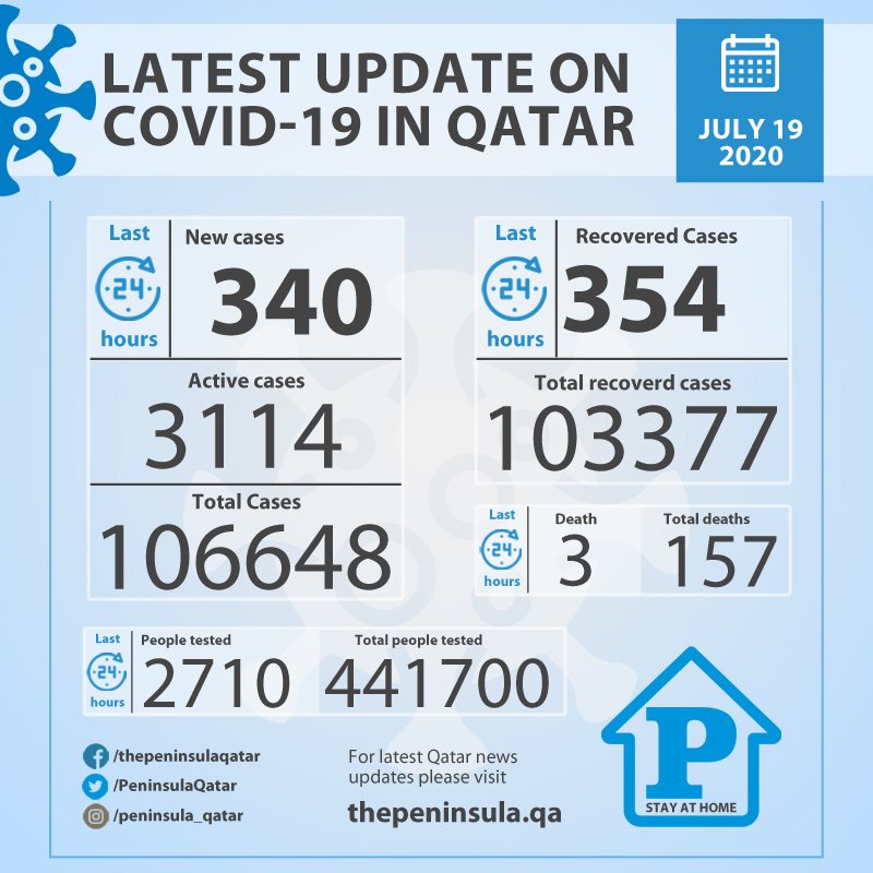 Ministry of Public Health today recorded 340 new cases of coronavirus (COVID-19) and 354 people recovered from the virus in the last 24 hours, bringing the total number of people recovered in Qatar to 103377. The Ministry also announced three deaths due to Covid-19.