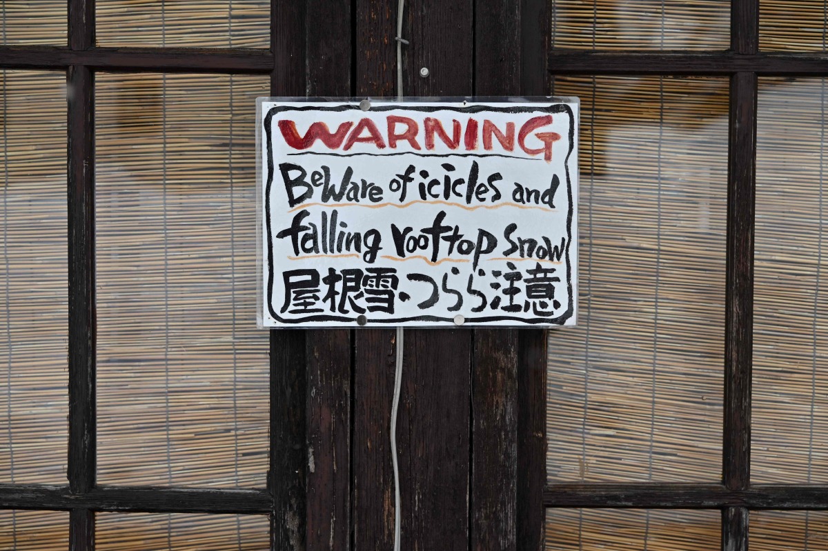 This photo taken on January 31, 2025 shows a sign on a commercial establishment warning people about icicles falling from the roofs of buildings, along a street in the ski resort town of Hakuba, Nagano prefecture. Photo by Richard A. Brooks / AFP