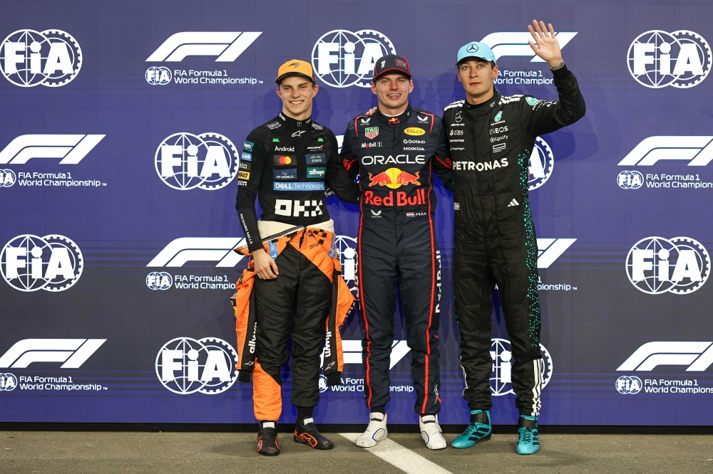 From left: McLaren's driver Oscar Piastri of Australia, Red Bull's driver Max Verstappen of the Netherlands and Mercedes's driver George Russell of Britain after the Qualifying session of the Formula One Saudi Arabia Grand Prix at the Jeddah Corniche Circuit in Jeddah, Saudi Arabia, on April 19, 2025. (Photo by Qian Jun/Xinhua)