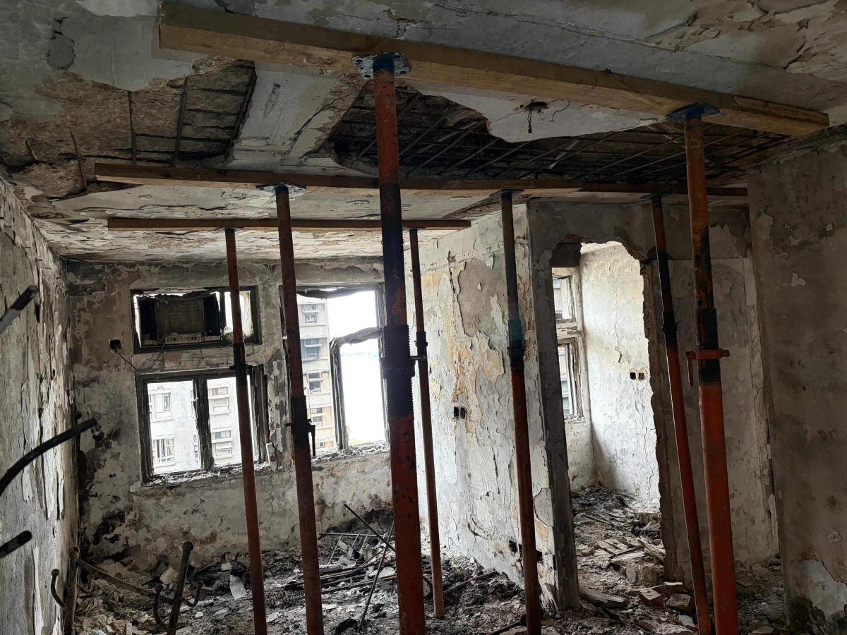 Damaged areas of the residential complex in Hong Kong's Tai Po district have been cordoned off as "danger zones", while reinforcement works have been carried out where the building structure was compromised.