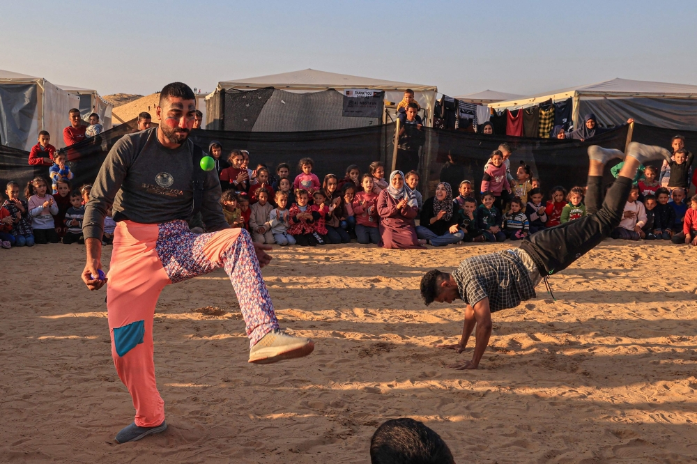 Men dressed as clowns perform for children participating in an activity in Rafah in the southern Gaza Strip on December 18, 2023. (Photo by Said Khatib / AFP)