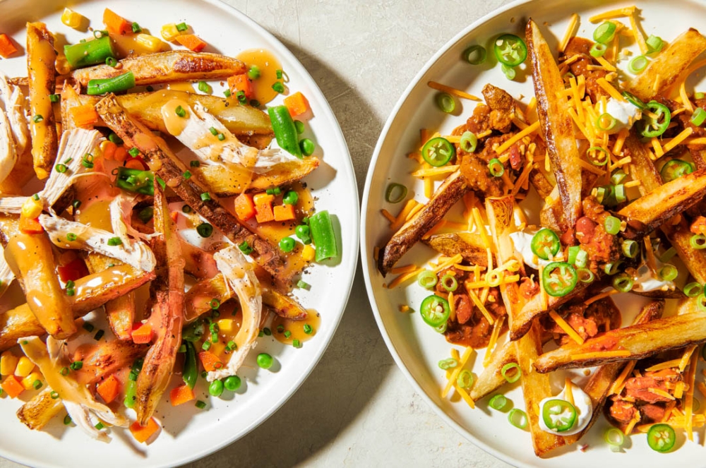 Just like pasta, rice, quinoa or other base ingredients, potatoes take well to seasoning throughout the cooking process. "I like to salt the water,” says O’Toole, "and throw in aromatics like onion, garlic or herbs to give the chips a little flavor boost.” Oven fries can be tossed with earthy spices before or after baking, then brightened with chopped fresh herbs. Once you start building the final dish, layer proteins and vegetables directly on top the hot fries before drizzling with any wet sauces - this helps keep the fries from getting completely soggy, while still allowing them to soak up the flavors of the other components. For fries directly topped with something like a rich Cincinnati chili, try a layer of fries, followed by a generous layer of sauce, then another layer of fries with less sauce, as well as shredded cheese and other garnishes, to help ensure a good ratio of crispy to smothered fries when serving.