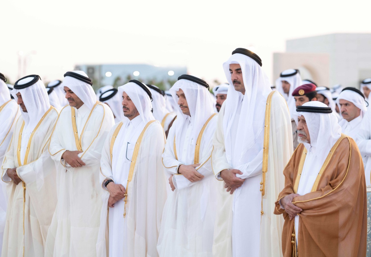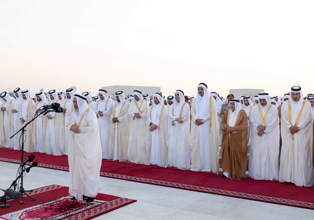 The prayer was also performed by Personal Representative of the Amir HH Sheikh Jassim bin Hamad Al-Thani, HH Sheikh Abdullah bin Khalifa Al-Thani, HE Sheikh Jassim bin Khalifa Al-Thani, Prime Minister and Minister of Foreign Affairs HE Sheikh Mohammed bin Abdulrahman bin Jassim Al-Thani, Speaker of the Shura Council HE Hassan bin Abdullah Al Ghanem, a number of their Excellencies sheikhs, members of the Shura Council, and a number of their Excellencies ambassadors and heads Diplomatic missions in the country.