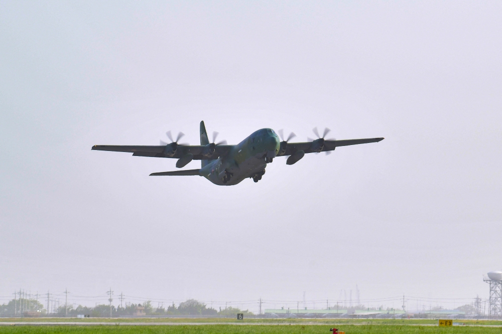 This handout photo taken on April 21, 2023 and provided by South Korean Defence Ministry shows a C-130J military transport aircraft carrying Combat Control Team members of the South Korean Air Force 5th Air Mobility Wing taking off from an air base to Sudan at an undisclosed location in South Korea. Seoul said on April 21, it would send a military aircraft and soldiers to evacuate South Korean nationals stranded in Sudan, where hundreds of people have died since fighting broke out last week. (Photo by Handout / South Korean Defence Ministry / AFP)