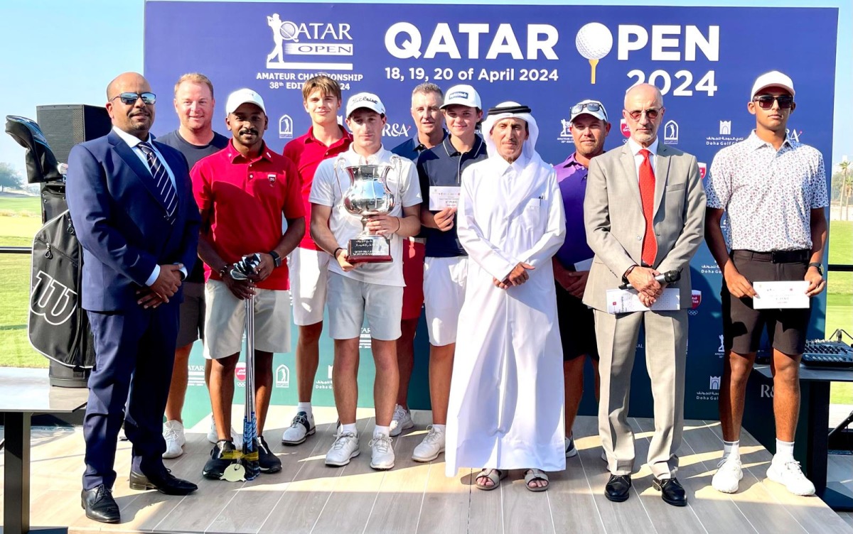 QGA Board Member Mohammed Faisal Al Naimi poses with the golfers as Calum Fitzgerald holds his trophy. Qatar’s Saleh Al Kaabi (front, second left) is also present along with other QGA and Doha Golf Club officials.