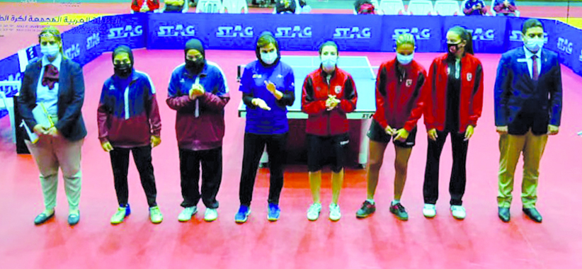 The members of the Qatar SC and Al Ahly women's teams pose for a photograph with officials during the Arab Club Table Tennis Championships which is currently being held in Jordan.