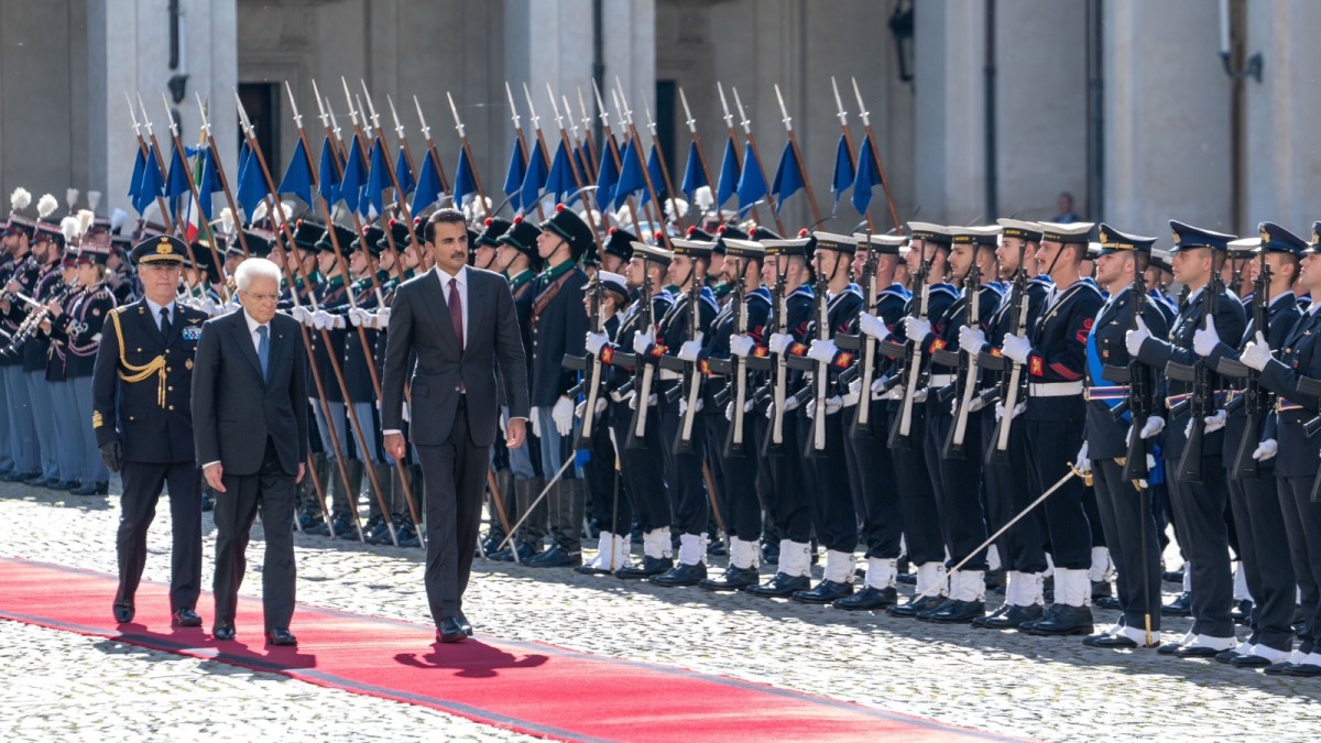 HH the Amir was accorded an official reception ceremony earlier upon his arrival at the Quirinale Presidential Palace.