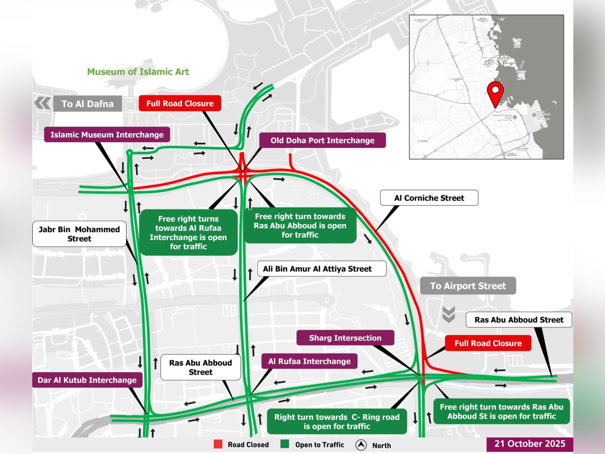 Doha, Qatar: The Public Works Authority, Ashghal, announced a temporary full road closure of the Old Doha Port Interchange to all traffic. Additionally, Corniche Street, from Sharq Interchange to the Islamic Museum Interchange, towards Al Dafna, will also be closed.