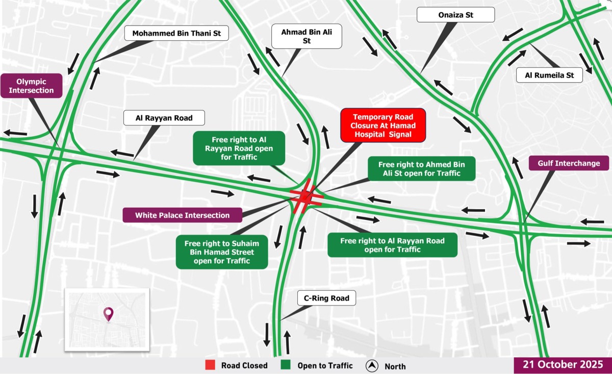 Doha, Qatar: The Public Works Authority, Ashghal, has announced the temporary complete road closure of Hamad Hospital Signal - White Palace Intersection.