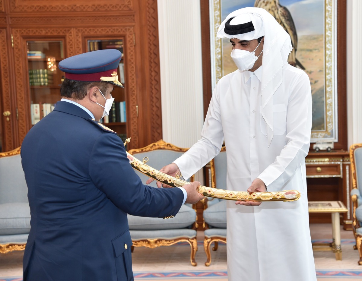 Doha: The Amir H H Sheikh Tamim bin Hamad Al Thani, honoured Staff Major General Mohammed Ali Ghanem Al Ghanem Al Maadeed and Staff Major General Pilot Mubarak Mohammed Al Kumait Al Khayarin by awarding them the military sword of Tamim bin Hamad Al Thani in appreciation of their distinguished role and efforts that they have undertaken throughout the period of their work, when His Highness met them at his office in the Amiri Diwan this morning.