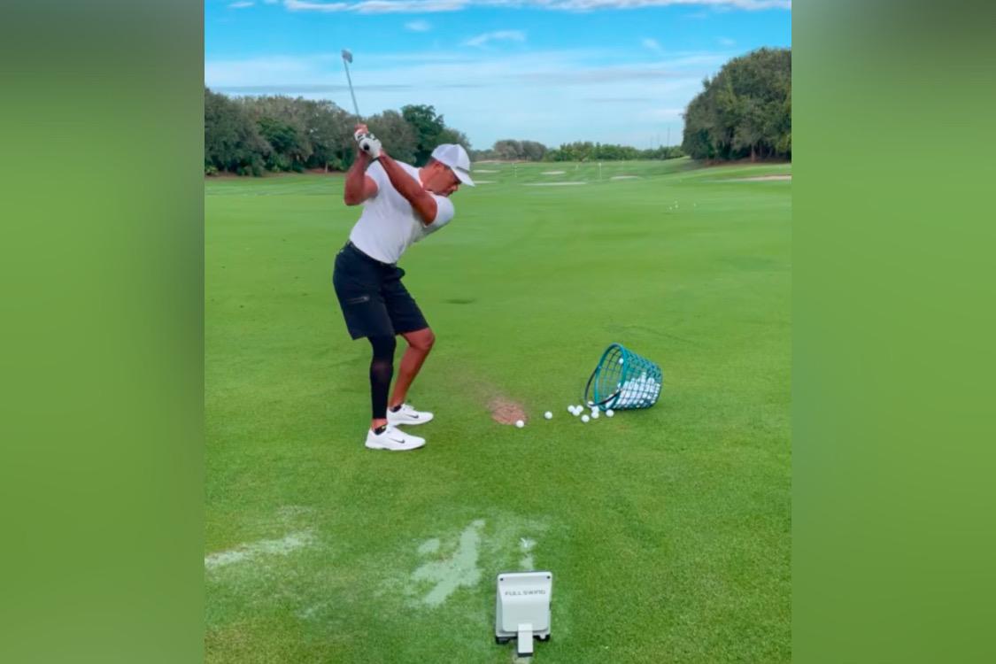 Tiger Woods on Sunday shared a three-second video clip of himself hitting golf balls for the first time since his February car crash.