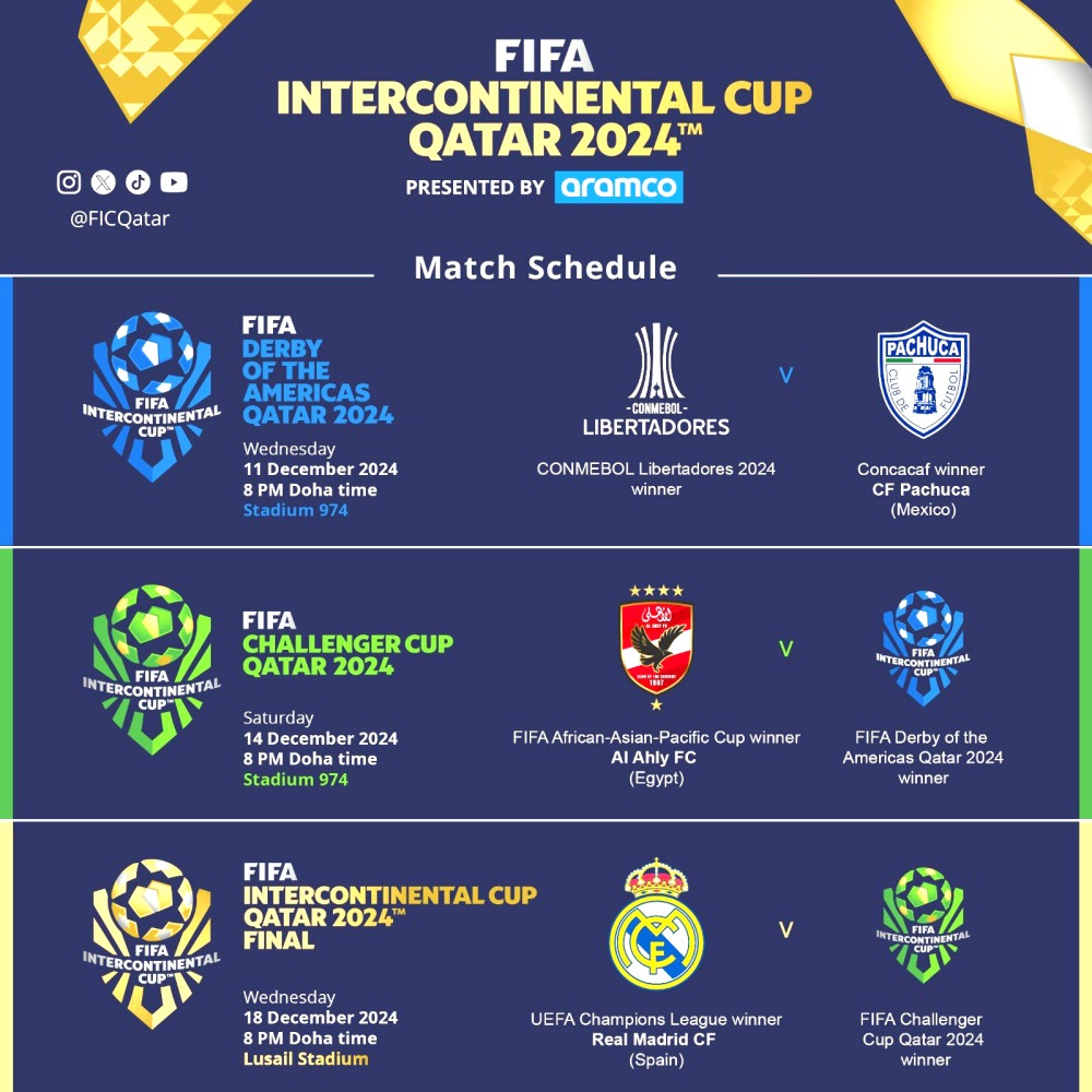 Continental club sides from around the world will contest the FIFA Derby of the Americas Qatar 2024 on December 11, the FIFA Challenger Cup Qatar 2024 on December 14 and the FIFA Intercontinental Cup on December 18.