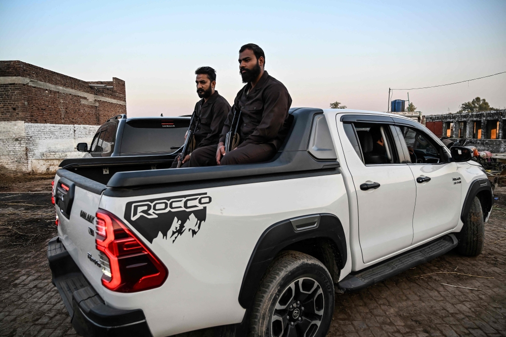 Armed private security personnel of politician Ali Warraich, sitting on the back of a Toyota Hilux pick-up truck locally known as 'Dala'. (Photo by Aamir Qureshi / AFP)
