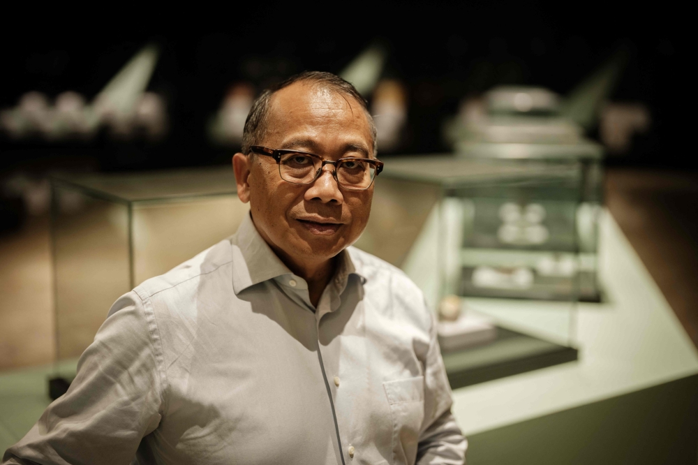 I Gusti Agung Wesaka Puja, head of the Indonesian Collection Repatriation Team in the Netherlands, posing in front of repatriated artifacts. (Photo by Yasuyoshi Chiba / AFP)