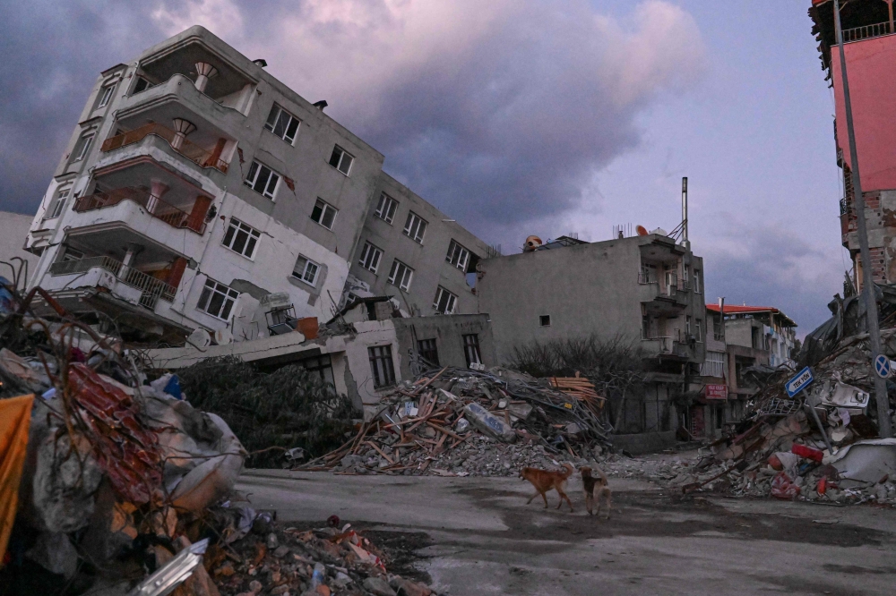 Dogs are seen on a street near the rubble of collapsed buildings, a day after a 6.4-magnitude earthquake struck the region, in the coastal city of Samandag on February 21, 2023. (Photo by Bulent Kilic / AFP)