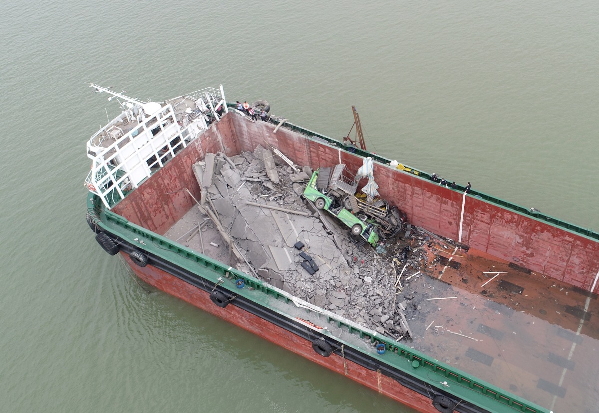 The Guangzhou maritime affairs bureau said the collision sent five vehicles, including a motorbike, tumbling off the bridge and either into the water or onto the ship below.