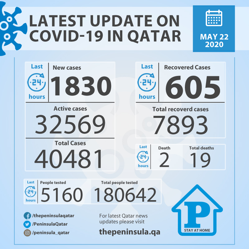 Ministry of Public Health today announces 1830 new confirmed cases of coronavirus (Covid-19), with 605 people having recovered from the disease in the last 24 hours. This brings the total number of recovery cases in the State of Qatar to 7893 cases. In addition, two people have sadly died from the virus in the last 24 hours