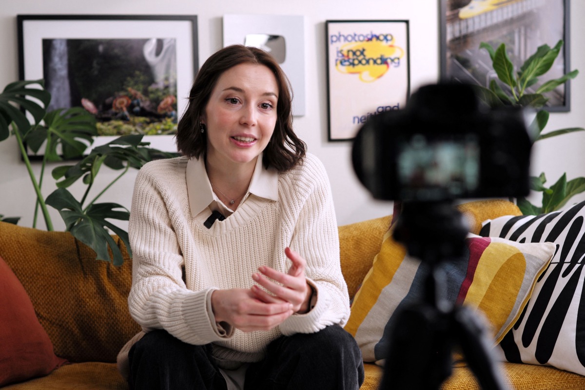 This photo taken on May 9, 2025 shows Australian YouTuber Hannah Price speaking to a camera at her office in Tokyo. Photo by Kazuhiro NOGI / AFP