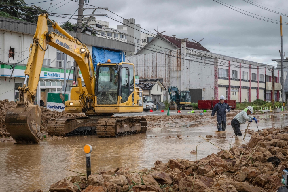 Workers clear debris and mud caused by heavy rain in Wajima city, Ishikawa prefecture on September 22, 2024. (Photo by Yuichi Yamazaki / AFP)