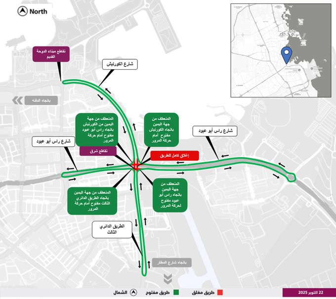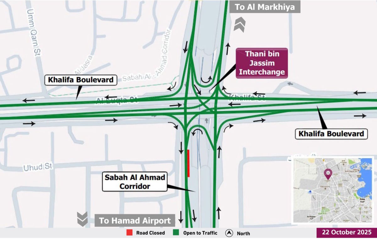 Ashghal announced closure of one southbound lane on Thani Bin Jassim interchange for a period of eight days starting from Thursday, October 23 until Friday, October 31, 2025, to carry out maintenance works in coordination with the General Directorate of Traffic.