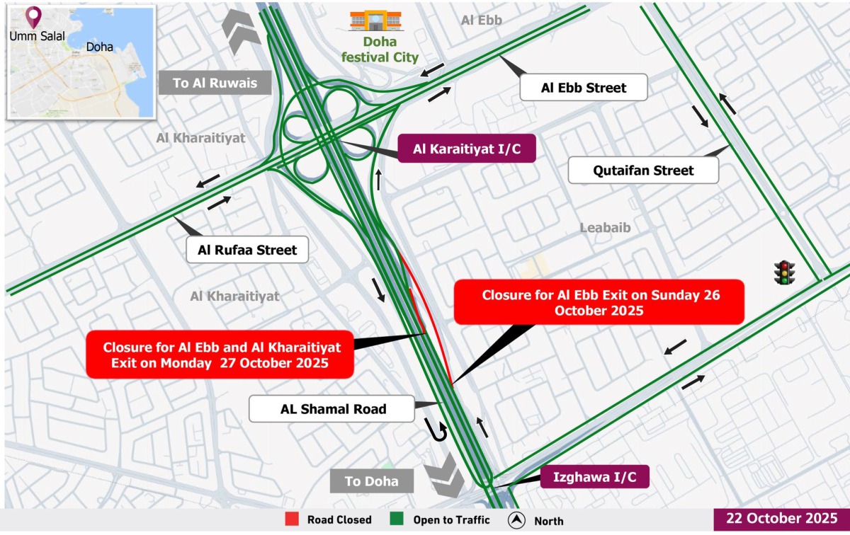 Road users coming from Izghawa towards Al Kharaitiyat Interchange will not be able to use the exit leading to Al Ebb from 12 midnight to 5am on Sunday, October 26, 2025. Meanwhile a temporary closure for the two lanes exit leading to Al Kharaitiyat and Al Ebb from Doha will also be in effect starting Monday, October 27, 2025, at 12 midnight till 5am.