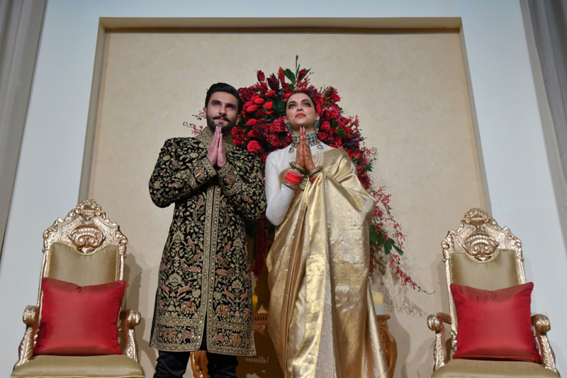 Indian Bollywood actors Ranveer Singh (L) and Deepika Padukone gesture to photographers following a photo opportunity during their wedding reception held at the Leela Palace in Bangalore on November 21, 2018. / AFP / MANJUNATH KIRAN