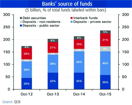 Citing Qatar’s official data, NBK analysts argues that declining foreign currency deposits in 2015 has been a major reason for the slowdown in Qatar’s M2 growth to 2.6 percent year-on-year. A pick-up in domestic and foreign credit helped boost asset growth in October by 10.6 percent to $294bn, or 140 percent, of GDP. Robust private sector credit growth of 23.5 percent year-on-year has been driven by lending to the consumption and real estate sectors.