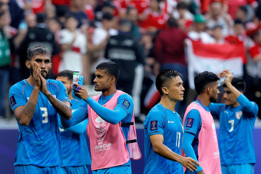 India's players salute the attendance after the Qatar 2023 AFC Asian Cup Group B football match between Syria and India at Al-Bayt Stadium in al-Khor, north of Doha, on January 23, 2024. (Photo by KARIM JAAFAR / AFP)