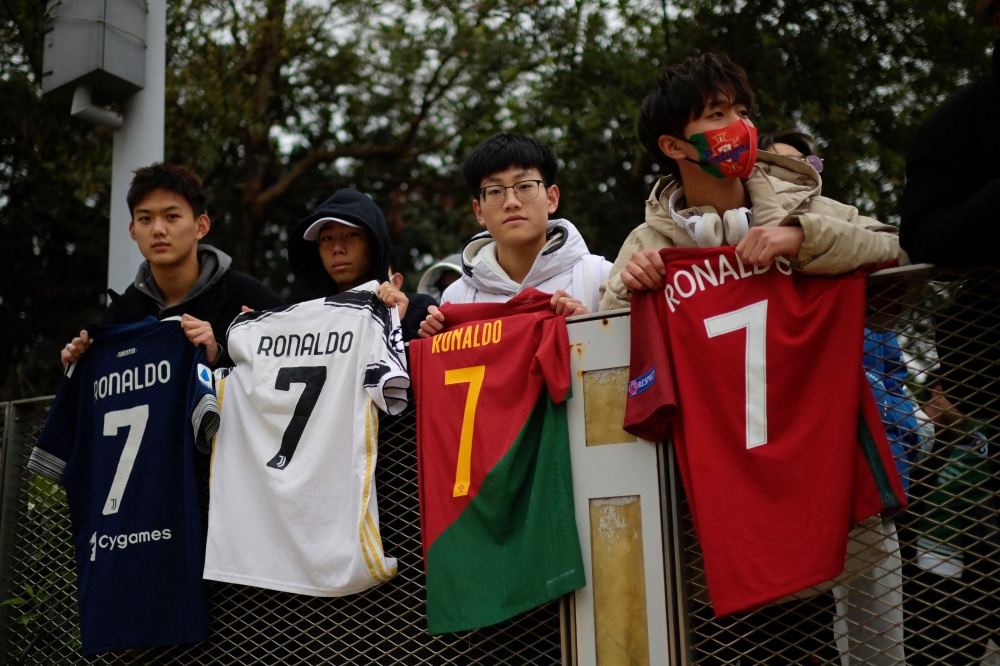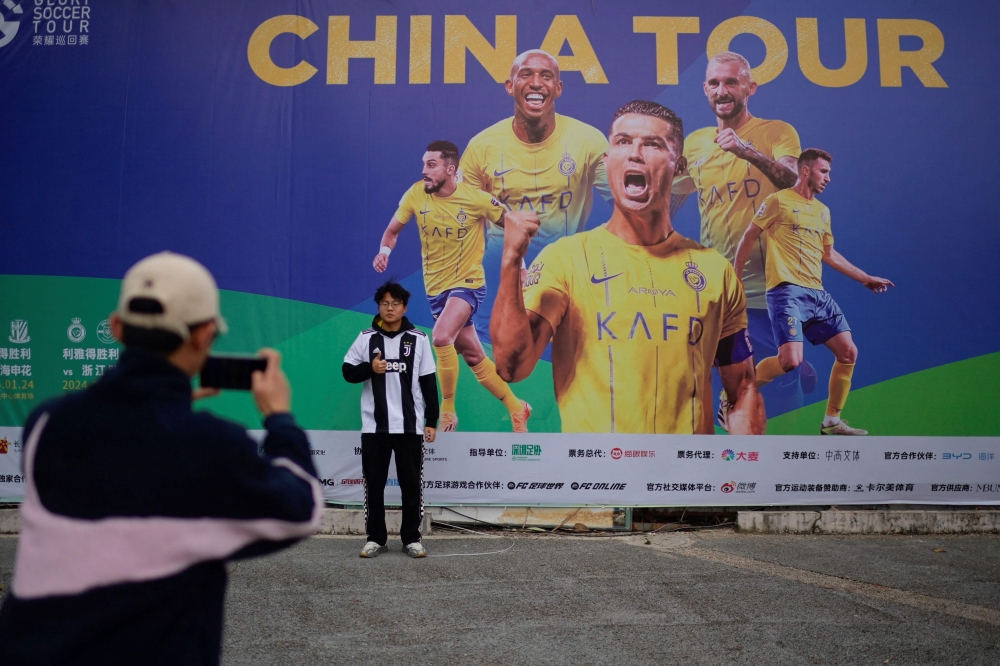 A fan of Cristiano Ronaldo of Al-Nassr poses for a picture prior to a training session ahead of the friendly match against Shanghai Shenhua during China Tour at the Universiade Sports Center in Shenzhen, Guangdong Province, on January 23, 2024. (Photo by Pedro Pardo / AFP)