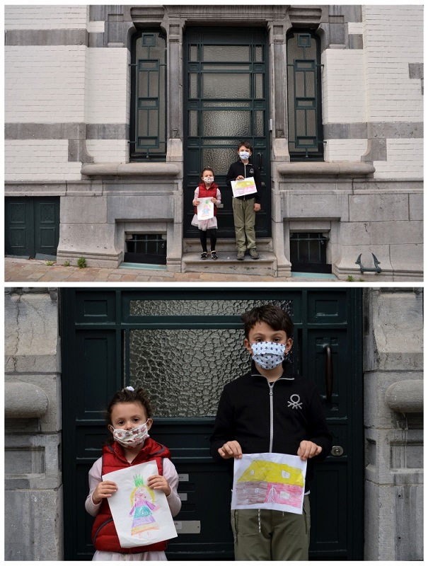 Marie Lou Belenyesi, 4, and Paolo Belenyesi, 9, pose for a photograph while holding pictures that they drew during the coronavirus disease (COVID-19) outbreak, as they stand by the entrance to their home in Brussels, Belgium, April 19, 2020. Reuters/Johanna Geron