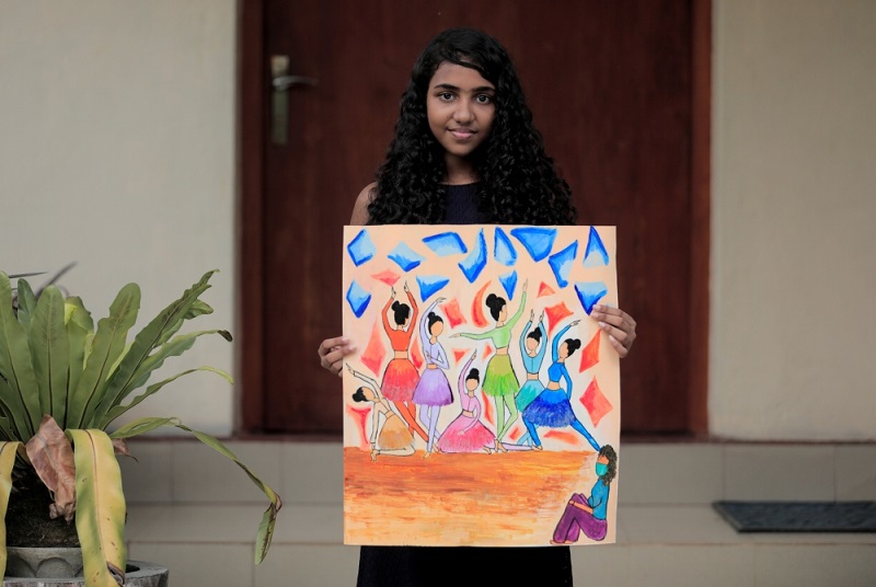 Sandithi Illeperuma, 14, poses for a photograph while holding a picture that she drew during the coronavirus disease (COVID-19) outbreak, as she stands in front of her home in Colombo, Sri Lanka, April 17, 2020. Reuters/Dinuka Liyanawatte