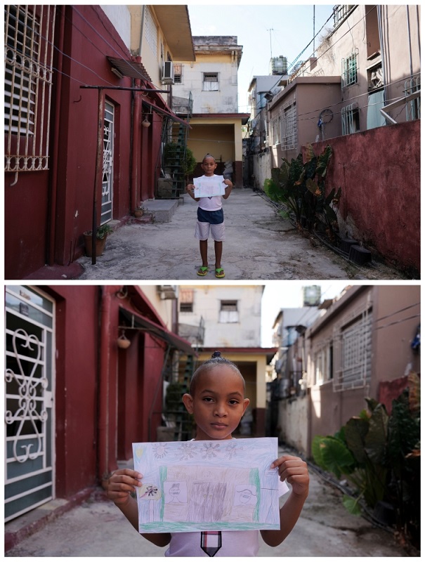 Combination picture showing Cristofer Lucas Reyes, 7, posing for a photograph while holding a picture that he drew during the coronavirus disease (COVID-19) outbreak, as he stands in front of his home in Havana, Cuba, April 20, 2020. REUTERS/Alexandre Meneghini