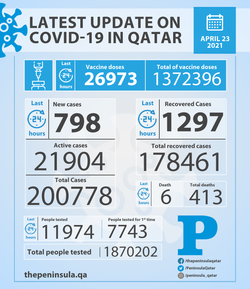 Doha: Ministry of Public Health (MoPH) today reported 798 new cases of coronavirus (Covid-19) and 1297 people recovered from the virus in the last 24 hours, bringing the total number of people recovered in Qatar to 178,461.