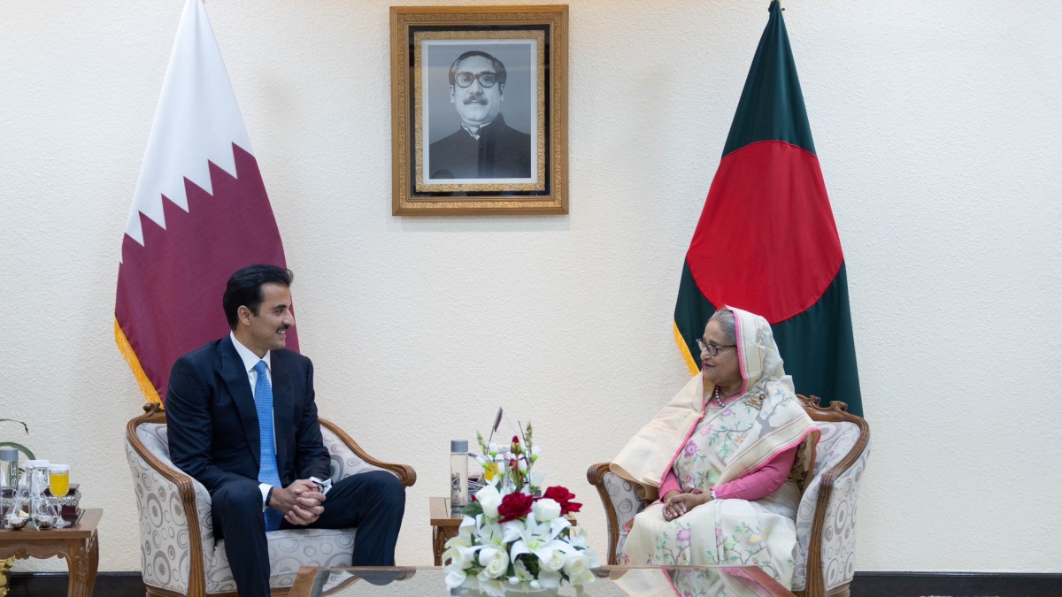 Doha, Qatar: The Amir His Highness Sheikh Tamim bin Hamad Al Thani, and Her Excellency Sheikh Hasina Wajed, Prime Minister of the friendly People's Republic of Bangladesh, held an official session of talks at the Prime Minister's office in the capital, Dhaka, today.