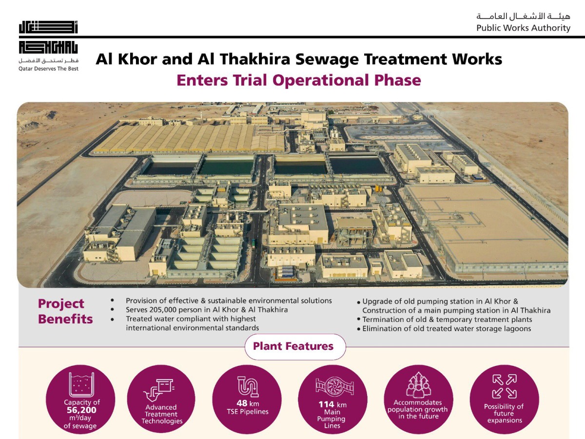 Doha: The Public Works Authority ‘Ashghal’ announced the completion of the main components of the New Al Khor and Al Thakhira Sewage Treatment Works (STW) project. The plant entered trial operational phase to serve more than 200,000 people in the cities of Al Khor and Al Thakhira in the North of Qatar.
