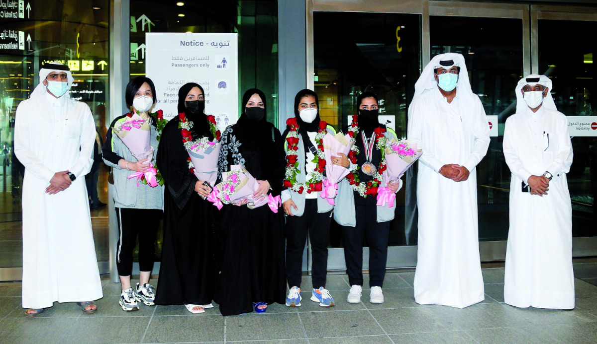 The Qatar women's table tennis team players and officials pose for a photograph with officials upon their arrival at the Hamad International Airport yesterday following their highly successful participation at the Arab Table Tennis Championships held in Amman, Jordan.