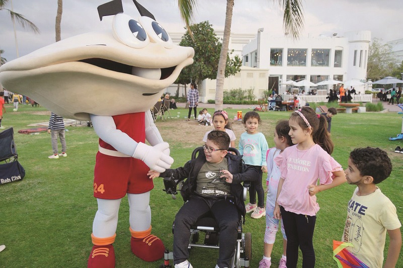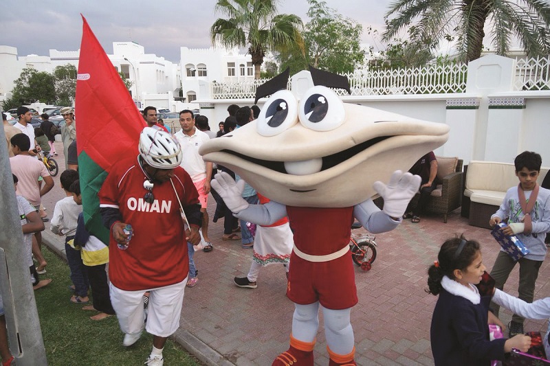 The official mascot for the 24th Arabian Gulf Cup, Sodeifi posing with fans on his trip to Oman.