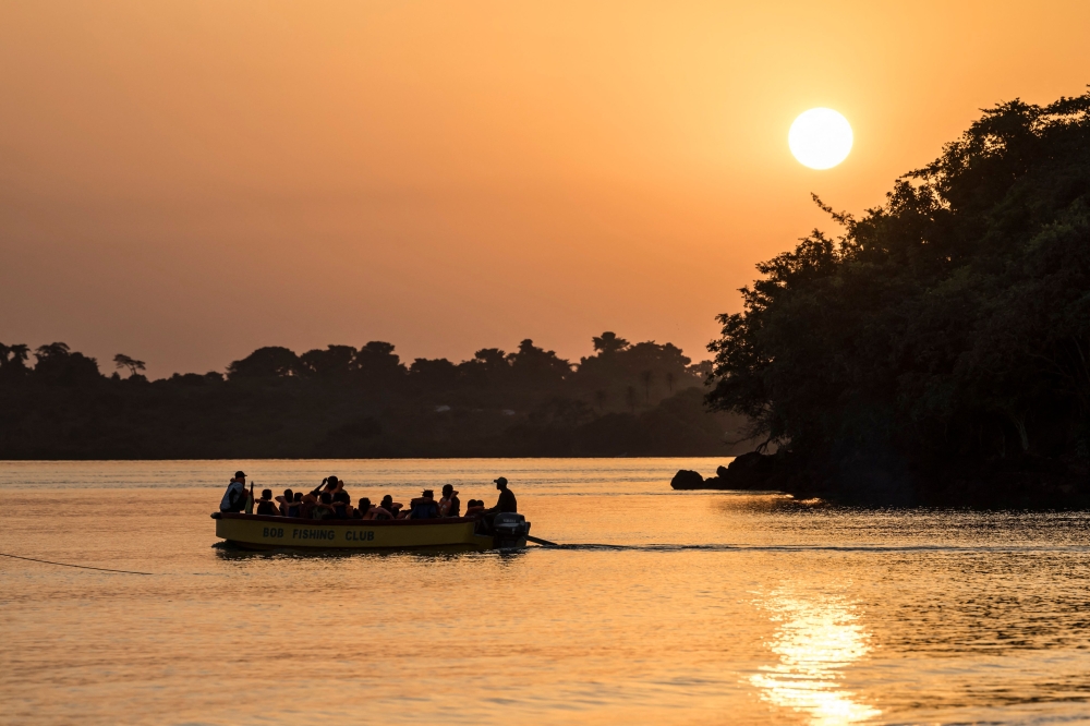 Passengers sail on a boat back to the island of Bubaque as the sun sets in the Bijagos Archipelago, on November 30, 2025.