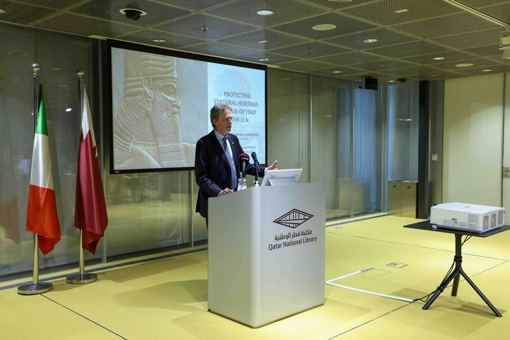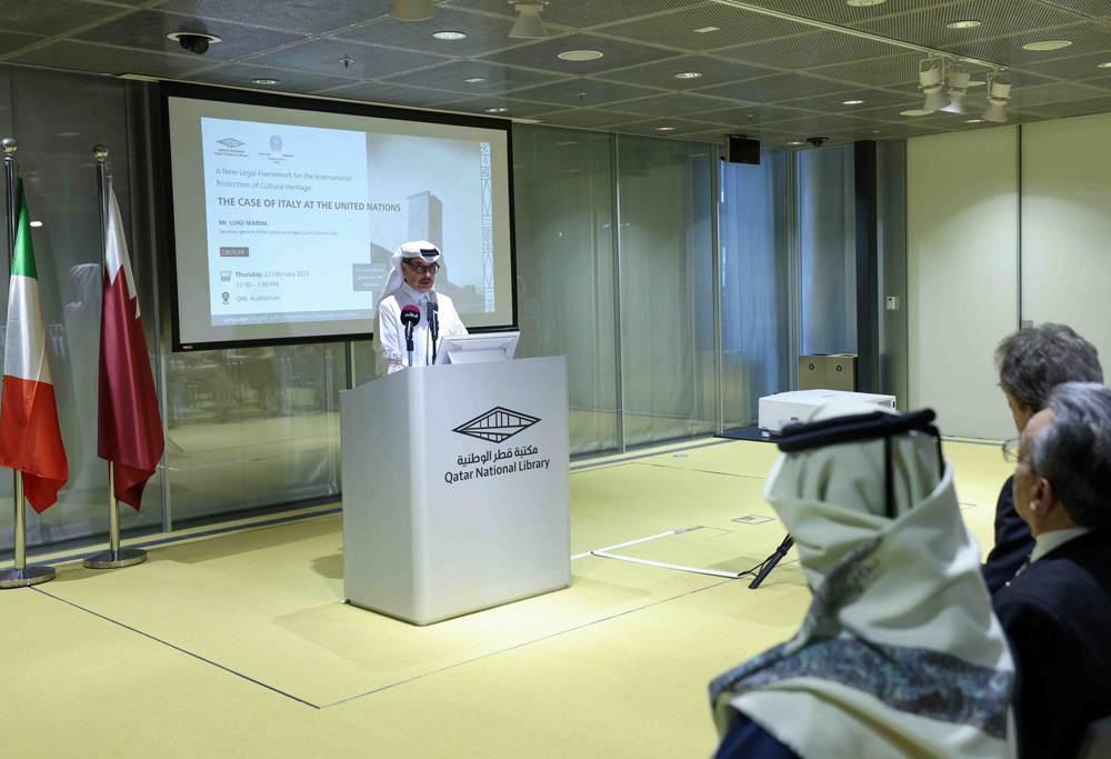 Doha: Qatar National Library, in cooperation with the Italian Embassy in Doha, hosted a special lecture by Luigi Marini, Secretary General of the Supreme Court of Cassation of Italy, exploring the progress being made toward a new legal framework for the international protection of cultural heritage. The special lecture is an initiative under the Himaya project, launched by the Library to combat illegal trafficking in documentary heritage in the region.